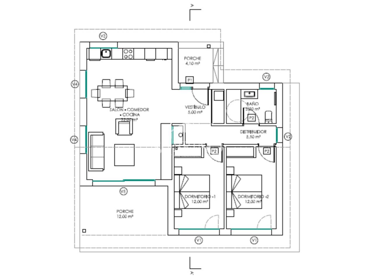 La distribución interior cuenta con una amplia zona de concepto abierto que integra salón, comedor y cocina totalmente equipada, creando un espacio acogedor y versátil, ideal tanto para la vida diaria como para reuniones. Dispone de dos dormitorios de buenas dimensiones, un baño completo y un agradable porche orientado al sur, perfecto para disfrutar del sol durante todo el año.